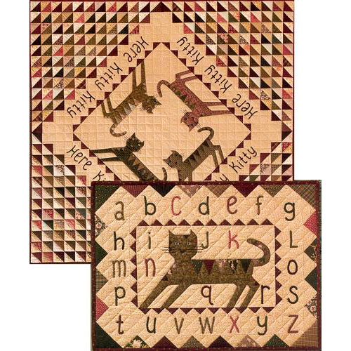 Measuring 24.5" x 32.5", Alphabet Cats features a folkart cat with a primitive style alphabet appliqued around it & a sawtooth border that is foundation pieced. The second quilt design included in this pattern is for Here Kitty Kitty, which measures 68.75" square. This larger quilt features four cats in a center diamond placement with the applique title letters in the middle border & a foundation pieced sawtooth border. Corner areas are pieced in a triangle pattern & button eyes finish the cats. Designed by Janet Miller