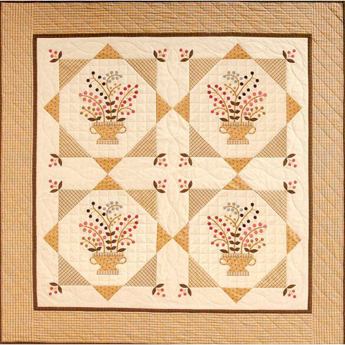 Featuring four Berry Basket blocks placed in a diagonal setting with small berry clusters at the corners of each block, this lovely quilt can be hand or machine appliqued. Measuring 75" square, we used fabrics of soft country pinks, rose, blue, tan & brown to complete our Berry Basket quilt. Designed by Janet Miller