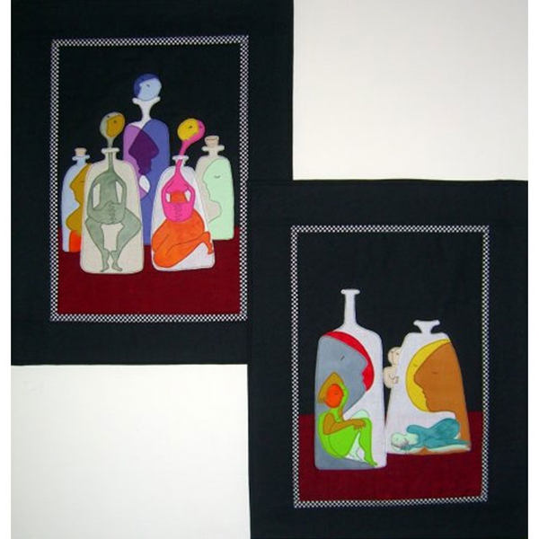 One of a series of three new art quilts, designs contributed by Joanne Thomson. Fun and quirky, "ladies in a bottle" are all appliqued wall hangings. Each pattern has designs for two quilts. Six quilts in three patterns. You might like to try them all! Finished size for each: 17" x 22"