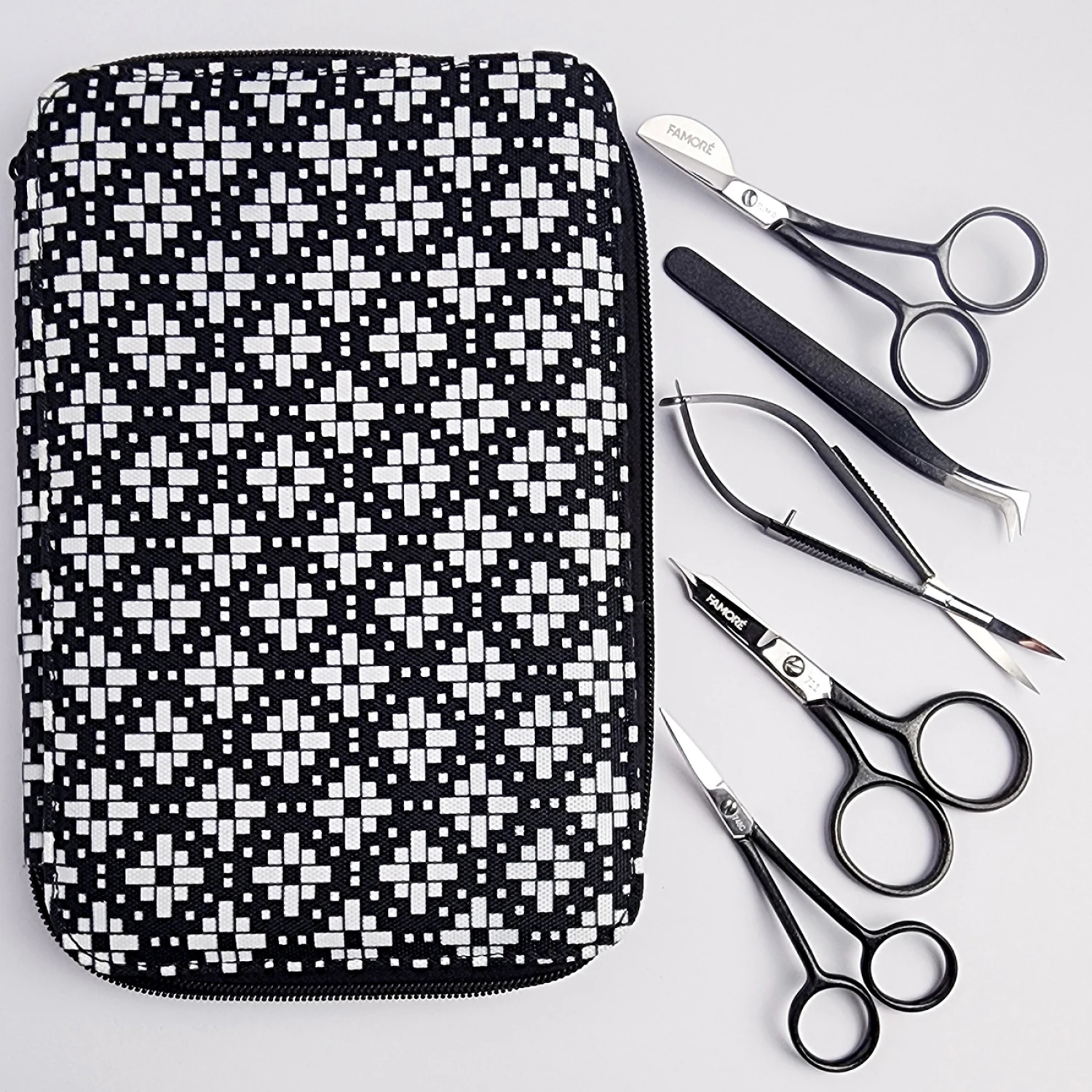 Made of: Metal & Polyester Color: Black and White Size: 6"W x 8.75"L. Unzipped laying flat is 12"W.