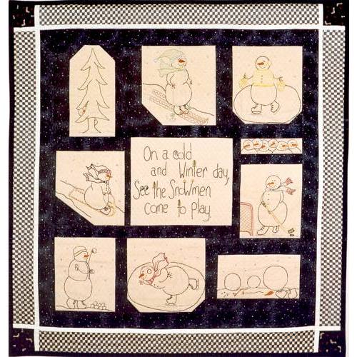 A whimsical look at Snowmen Playing in the winter as they skate, ski, toboggan, play hockey & throw snowballs across this delightful stitchery quilt that measures 41" x 39" when finished. Stitched in the center of all this activity you'll find an invitation - "On a cold and winter day, see the snowmen come to play" - that's hard to resist. All patterns include a thread chart & use four basic stitches: Backstitch, Running Stitch, French Knot & Lazy Daisy. Designed by Dougal Ann Walker.