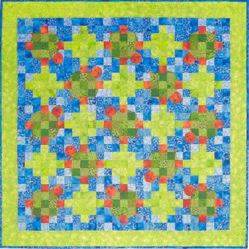 Turtles are great! They remind us to slow the pace of our busy lives & remain persistent in the long race. Measuring 44.25" square, Turtles Afloat combines some paper foundation piecing with traditional piecing & a bit of machine applique to create a colorful quilt of turtles quietly floating along in a water garden of lily pads. We used 5-6 blue fabrics for our water & 3-4 green prints for the lily pads with red fabrics for the turtle heads & legs. Isn't it about time for you to slow down & join these floating turtles? Designed by Kay Gentry